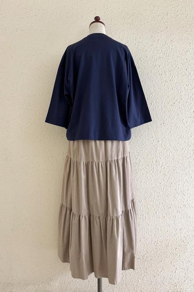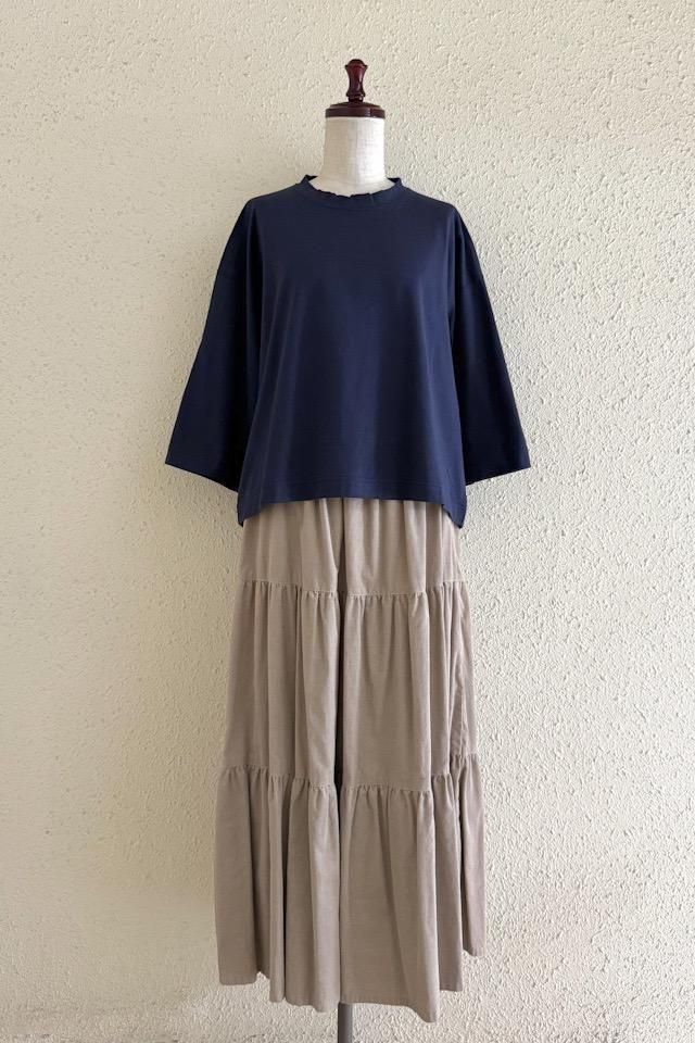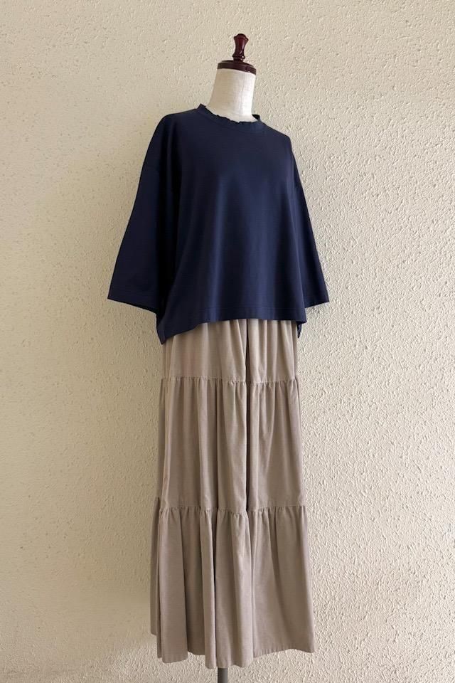 一枚でも様になり、カーディガンやパーカーを羽織ってもバランスの良いデザインです。