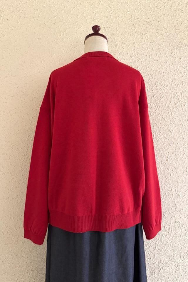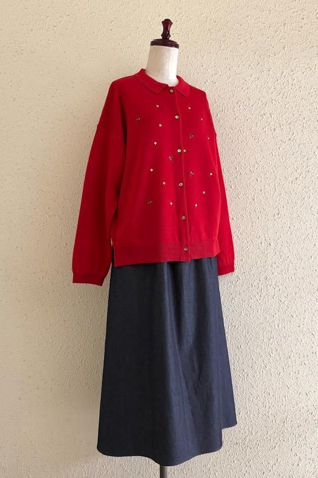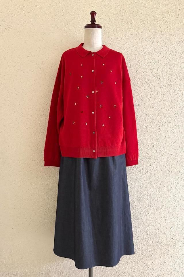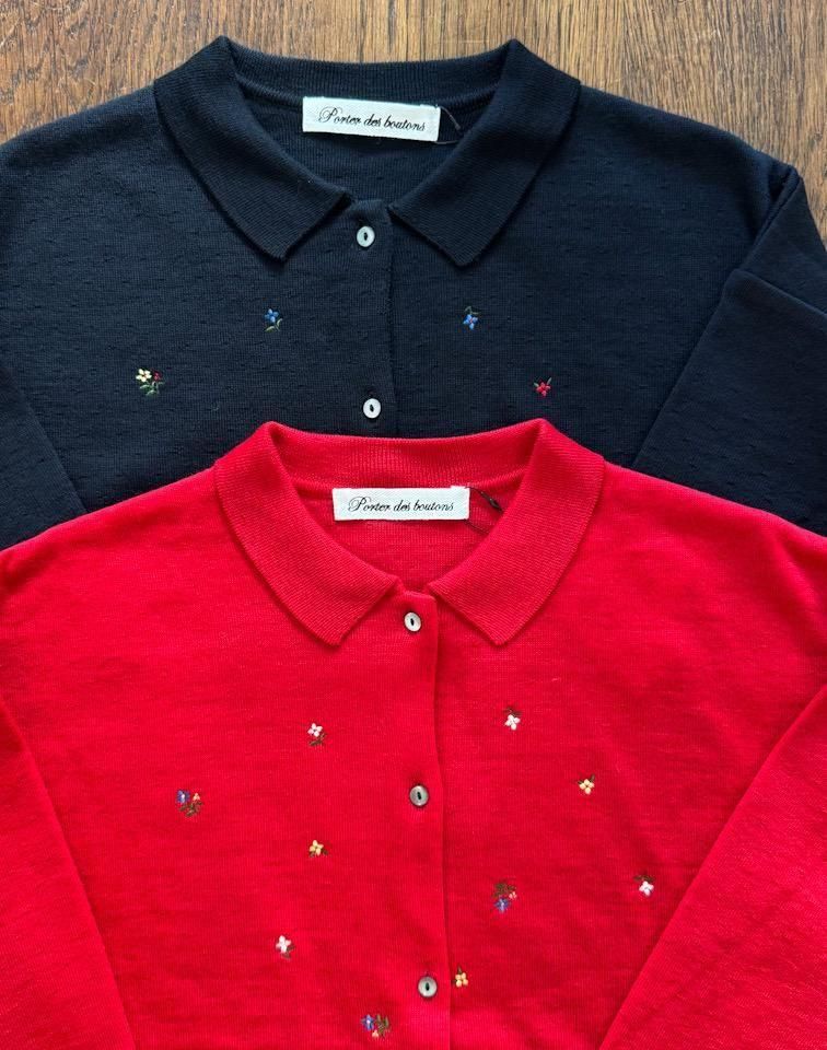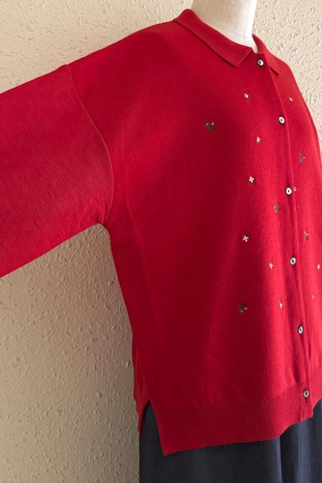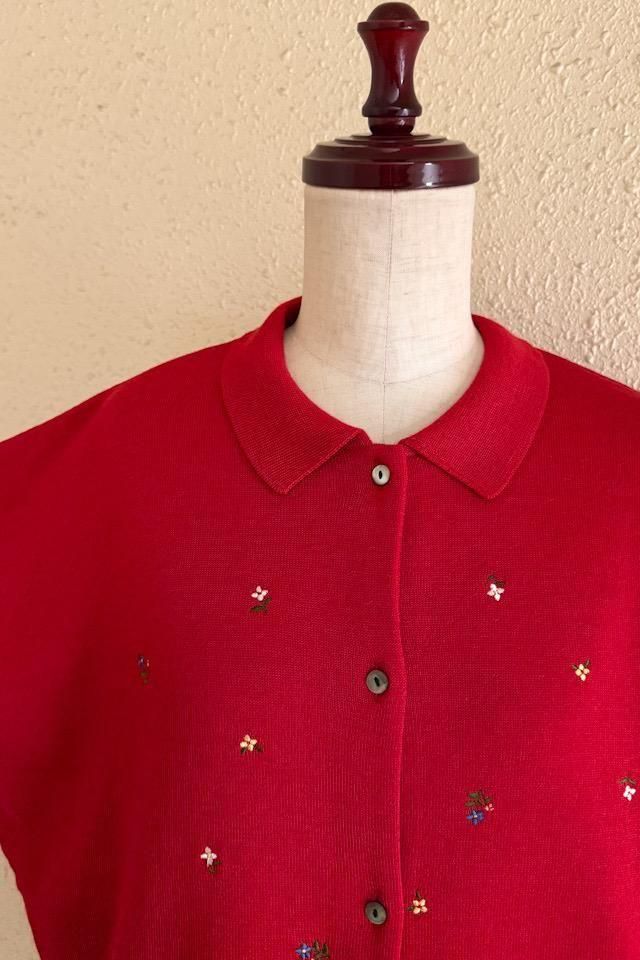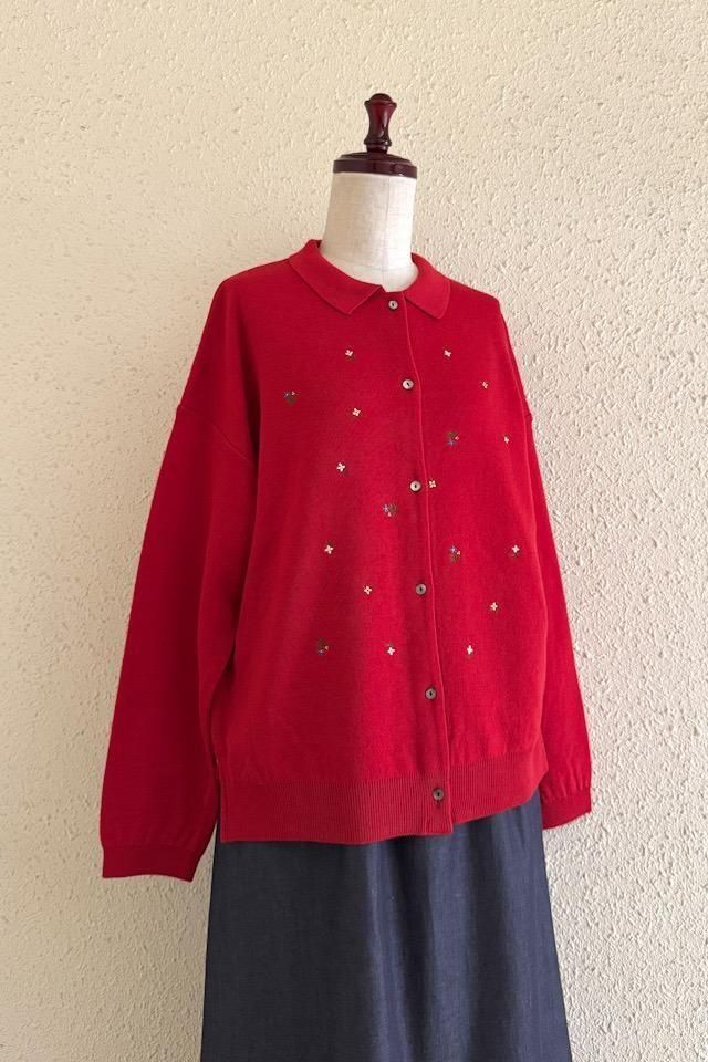 Porter des boutons flower刺繍ポロカラーニットカーディガン レッド