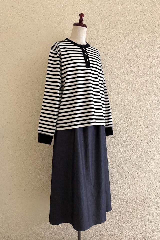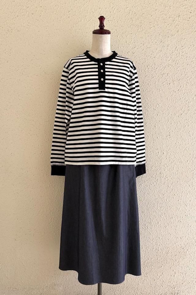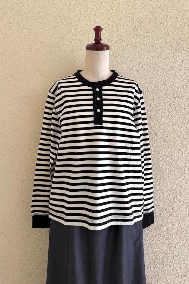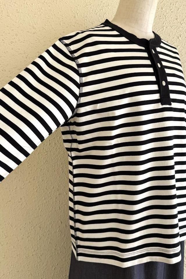 シンプルなボーダーにヘンリーネックと表面のステッチがアクセント。