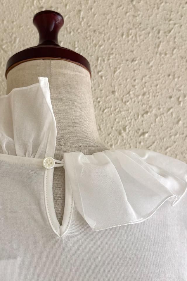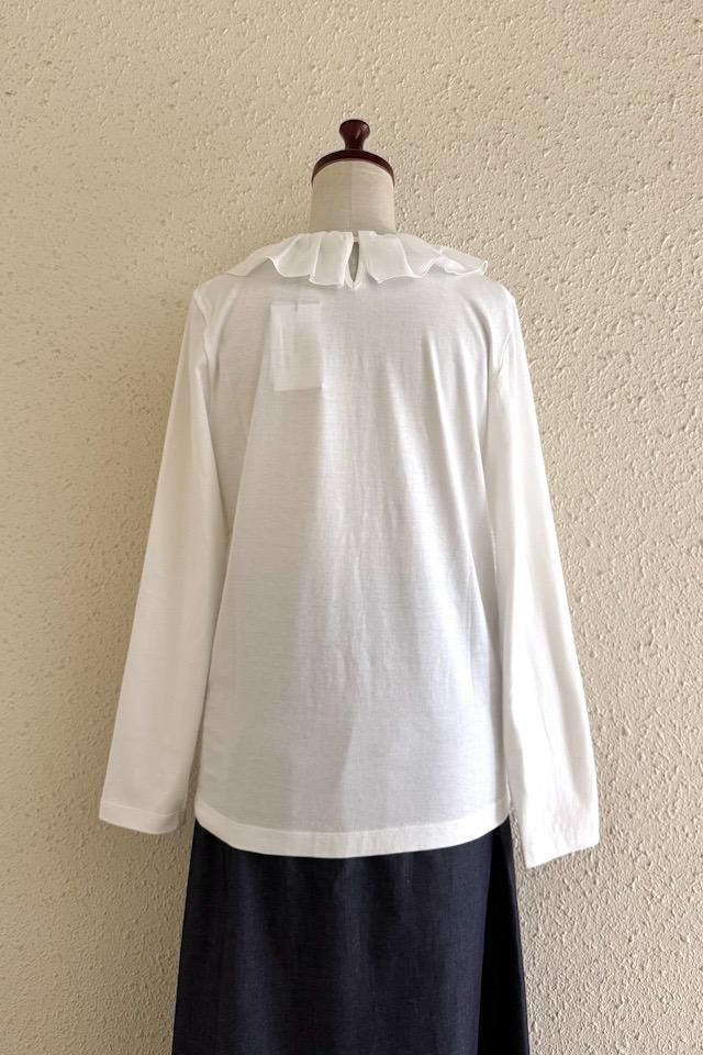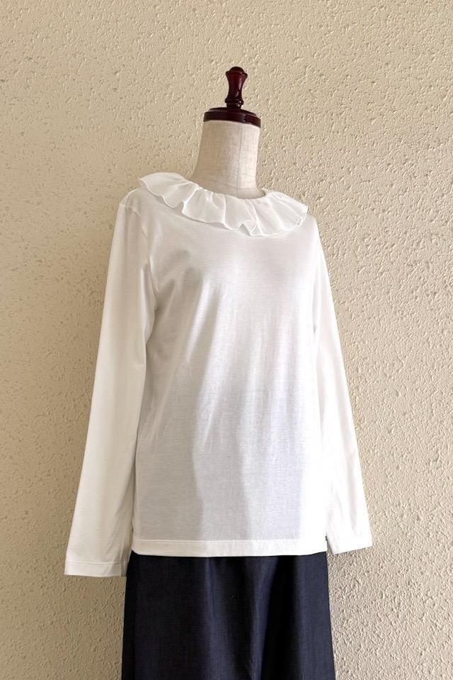 フリルカラーを飾ったカジュアルで可愛らしいカットソーTシャツ。