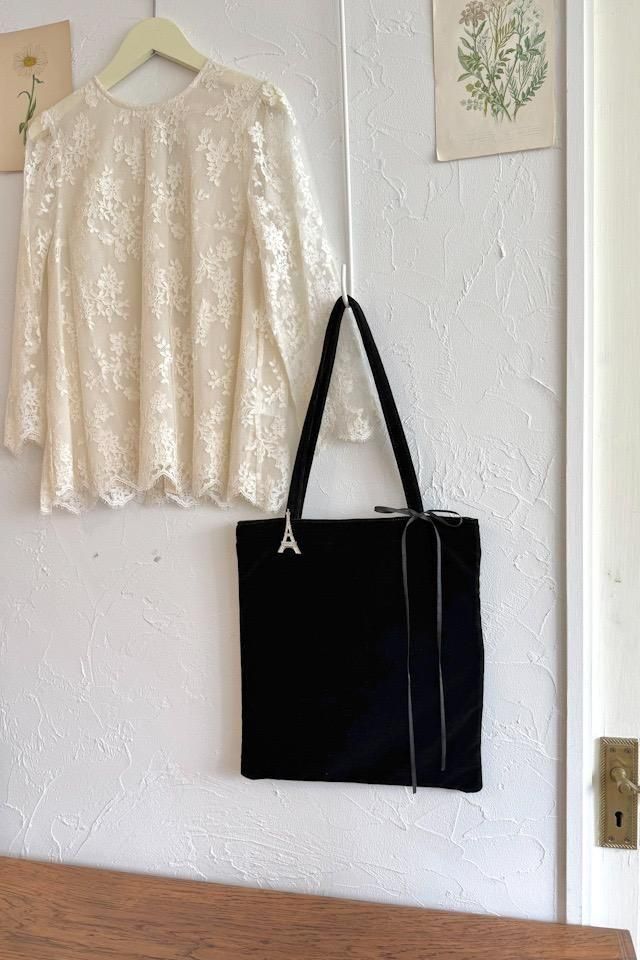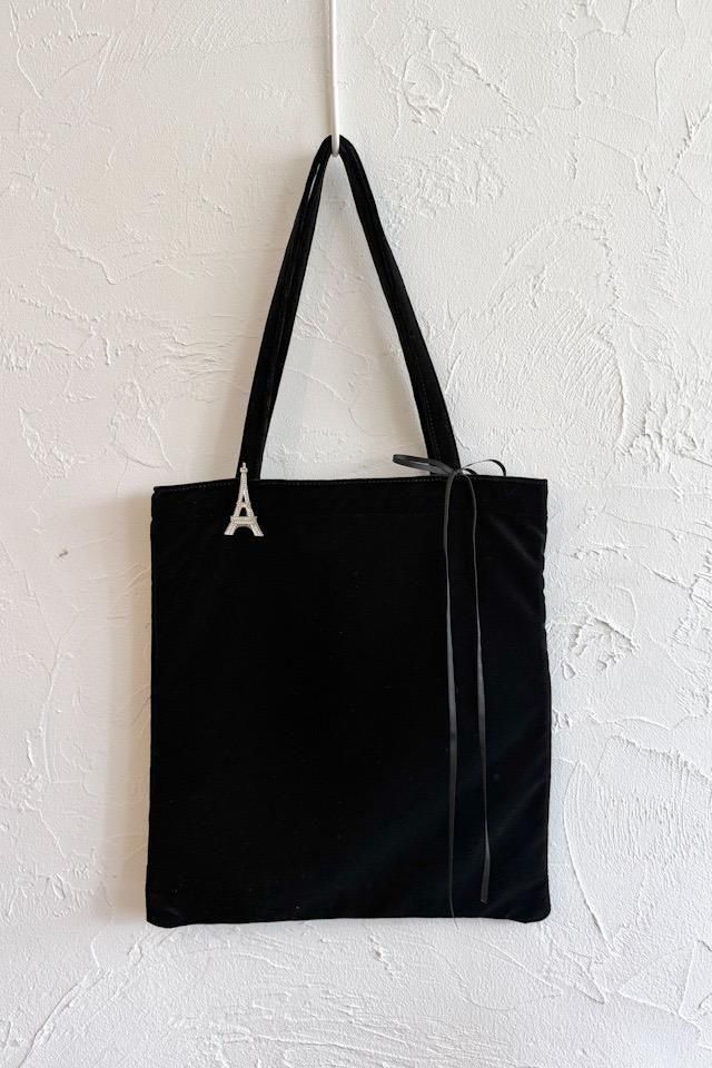 しなやかなベルベット素材のバッグにエッフェル塔モチーフのブローチがアクセント。