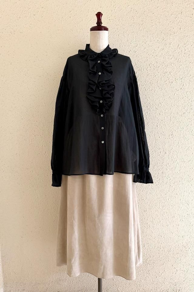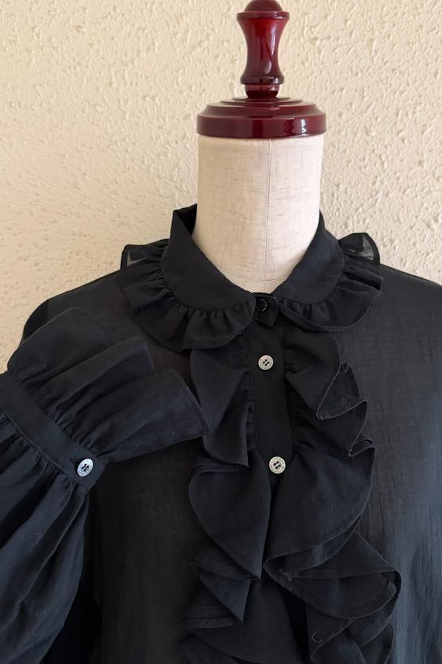 薄く柔らかなコットンシフォンにフリルカラーと、フロントにラッフルをあしらった