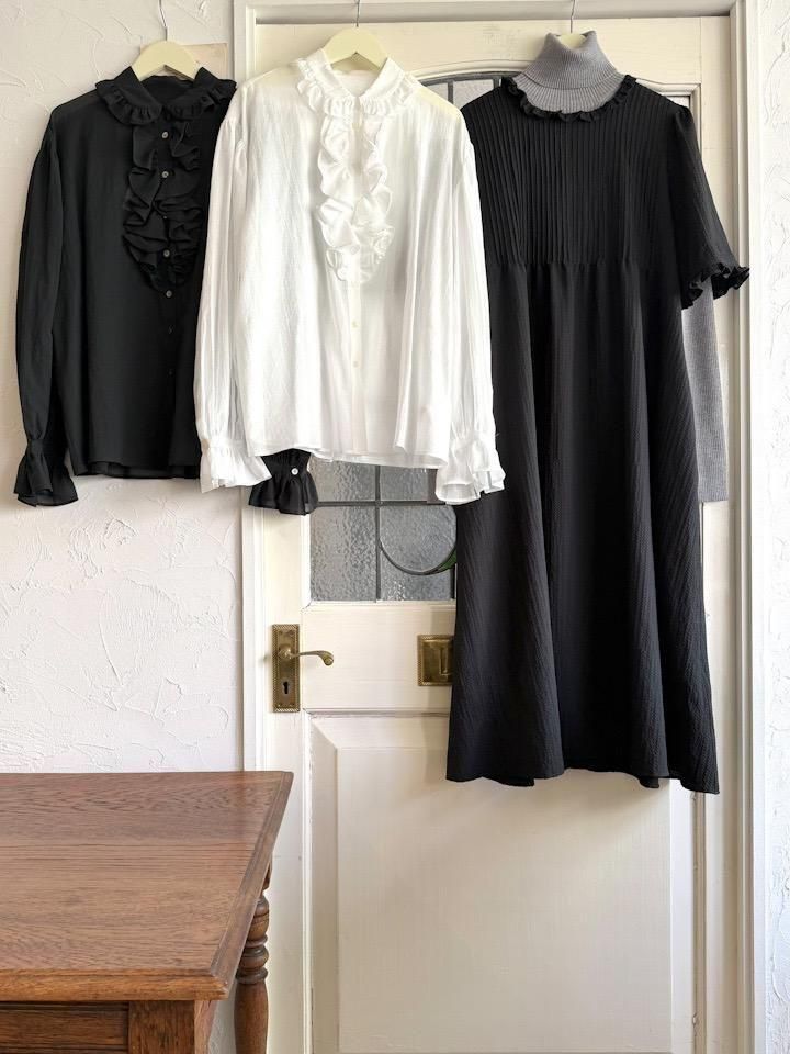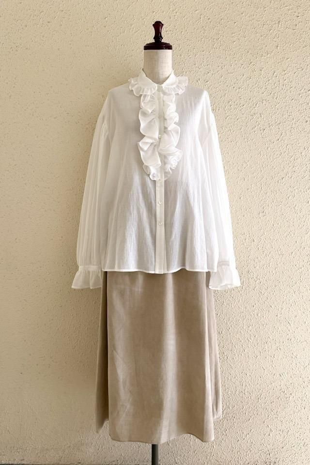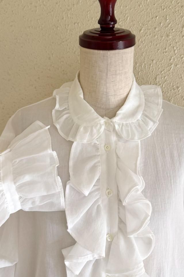 薄く柔らかなコットンシフォンにフリルカラーと、フロントにラッフルをあしらった