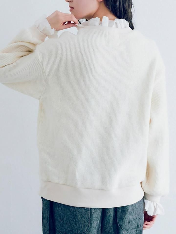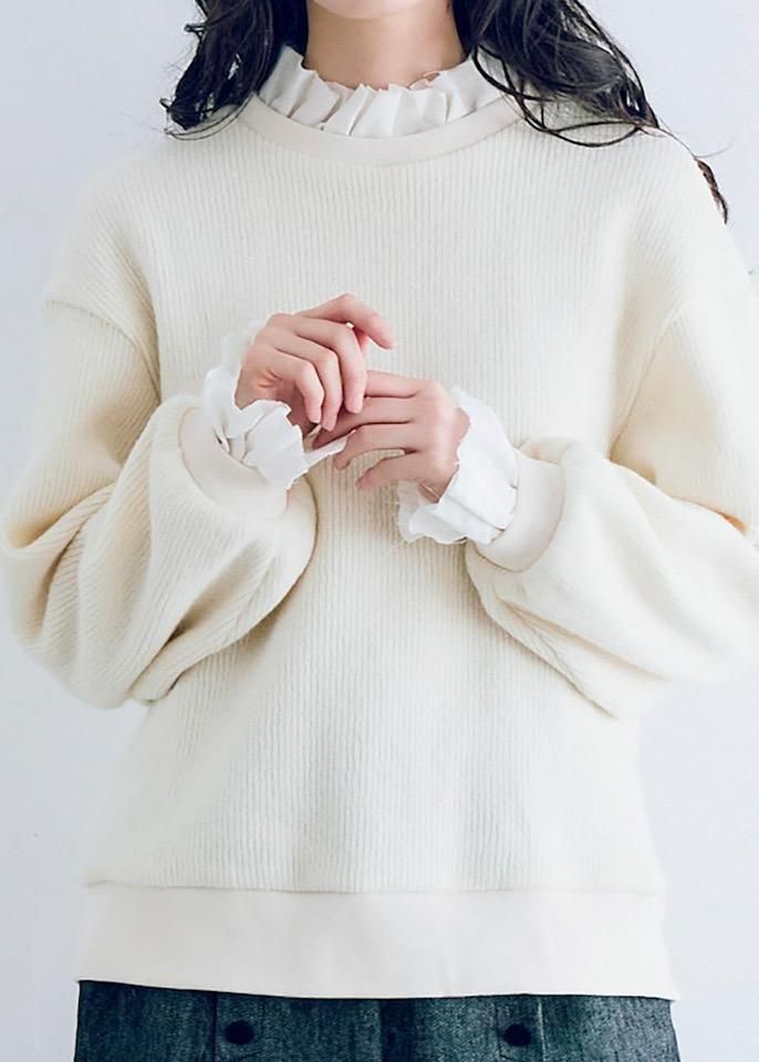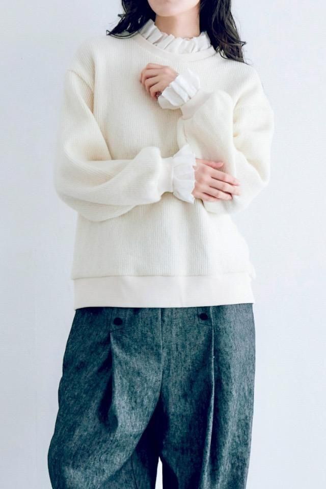 フリルカラーとカフスがアクセントのプルオーバーニット。
