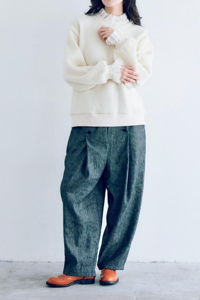 *フリルは切りっぱなし仕様となっており、着ていくうちにフリルは古布のように、味のある雰囲気に変化していきます。縫い留めのステッチを施していますが、ほつれた糸は、お好みでカットして取り除いてください*