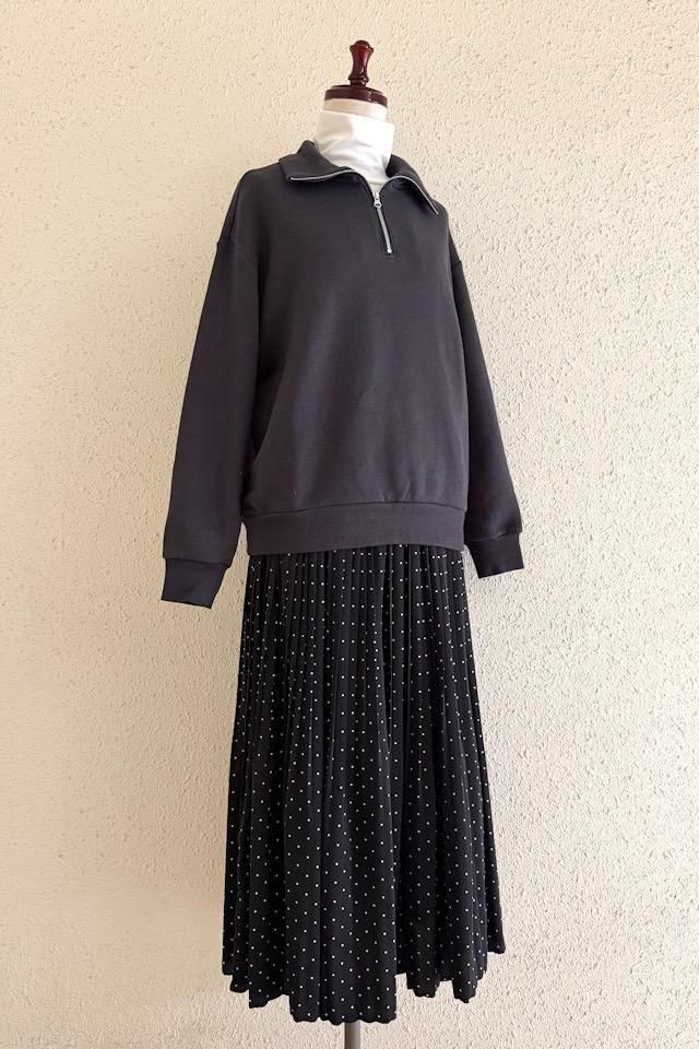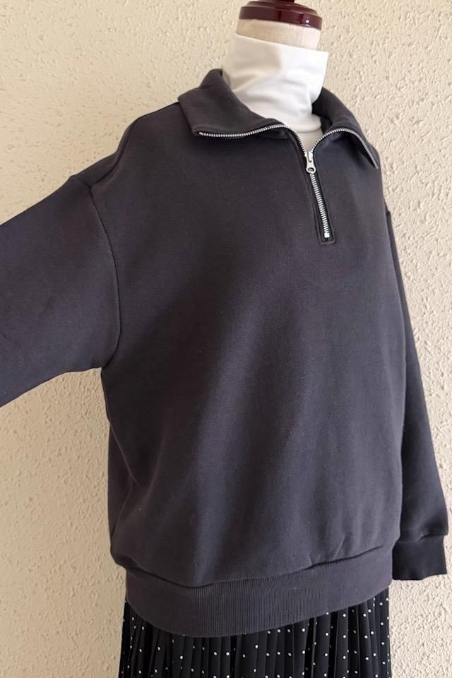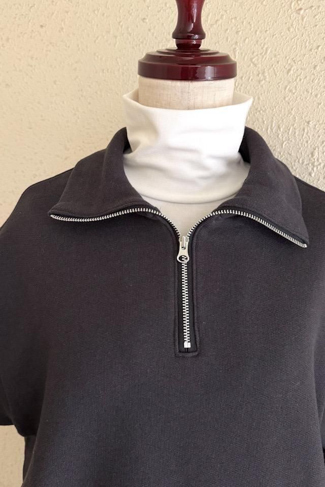 着こなしのアクセントになるハープジップのスウェットは、襟ようなデザインが印象的で、